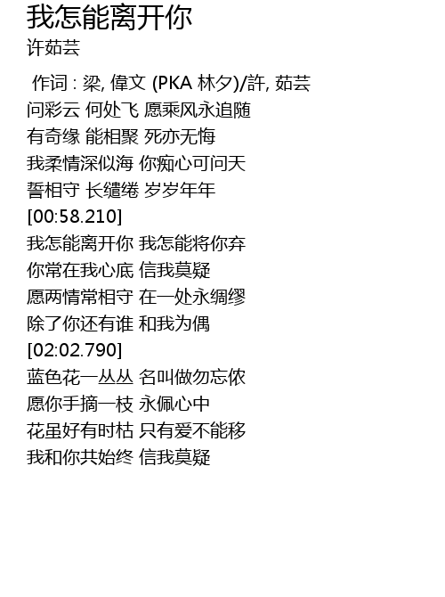| [00:00.00] | 作词 : 梁, 偉文 (PKA 林夕)/許, 茹芸 |