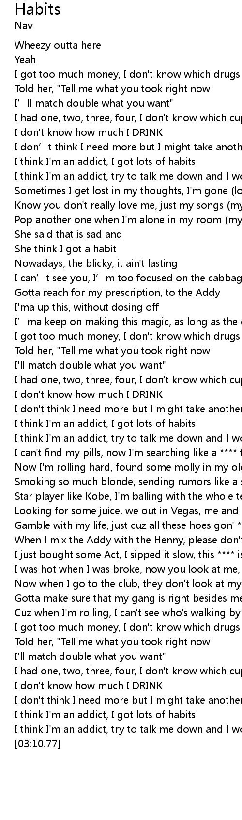 | [01:46.58] | I think I'm an addict, I got lots of habits |