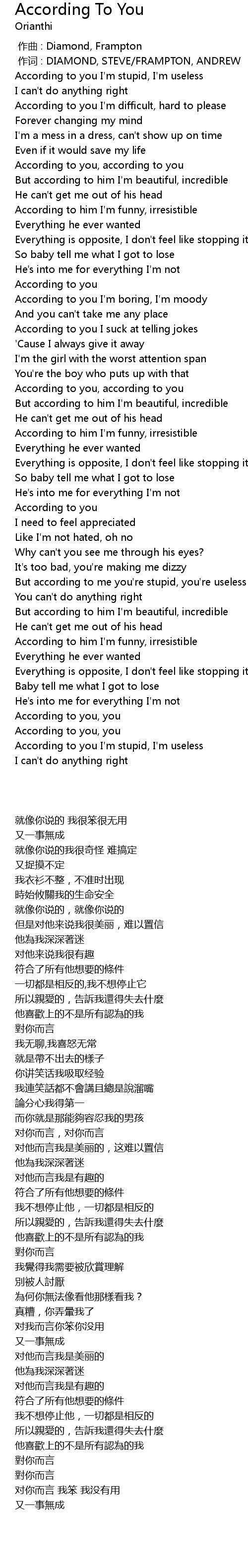 | [00:02.210] | According to you I'm stupid, I'm useless |