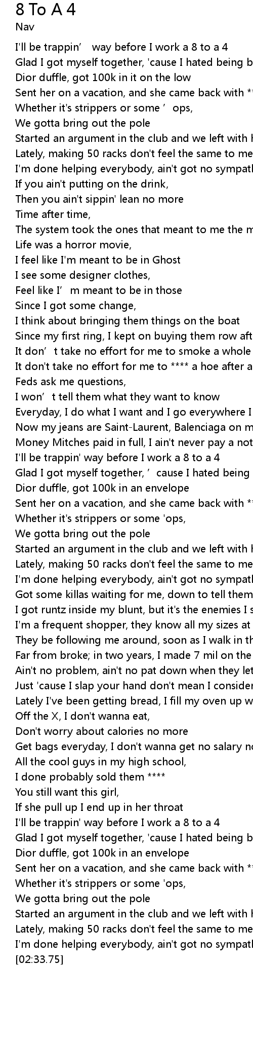| [02:27.56] | Lately, making 50 racks don't feel the same to me no more |