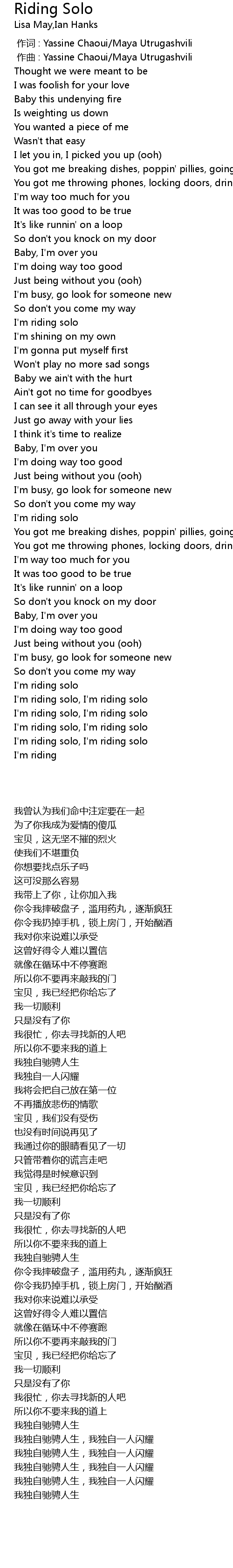 | [02:23.02] | I' m riding solo, I' m riding solo |