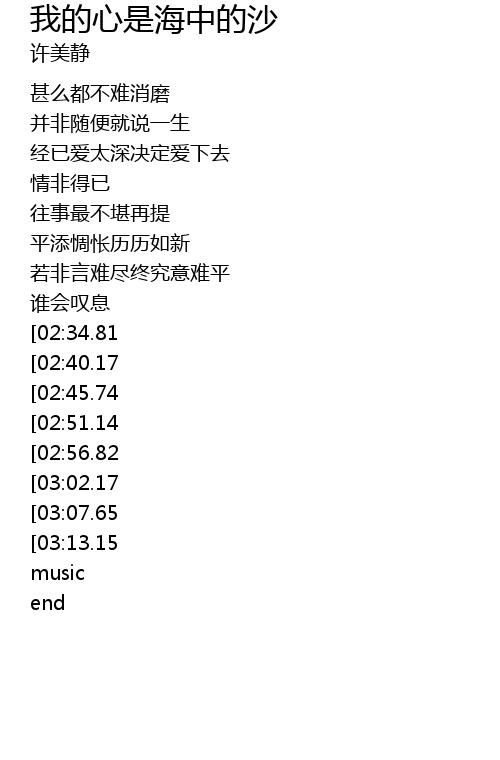 | [03:18.93][02:34.81][01:06.01] | 我的心是海中的沙 |
