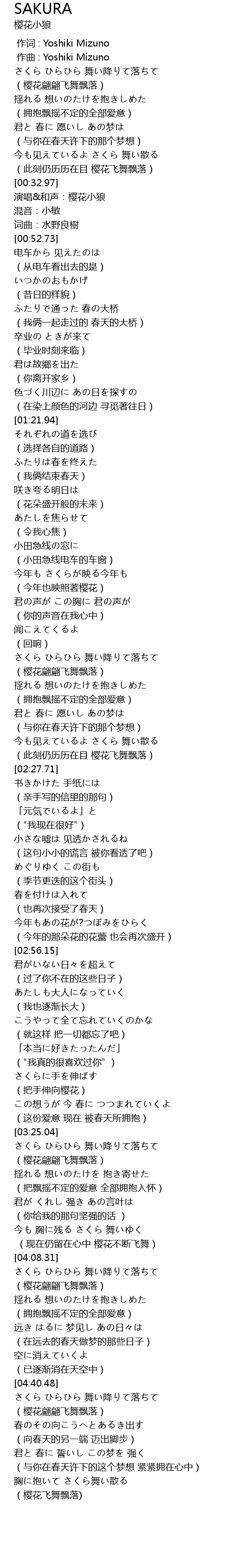 | [01:52.01] | さくら ひらひら 舞い降りて落ちて |