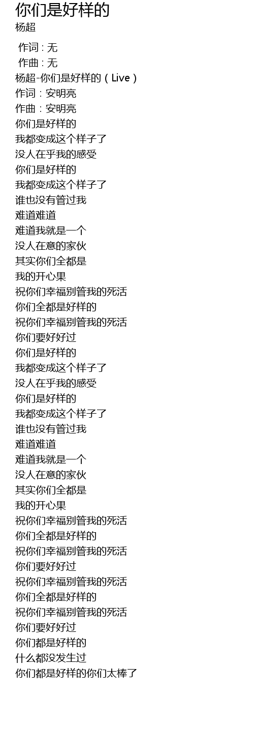 | [00:00.406] | 杨超-你们是好样的(Live) |