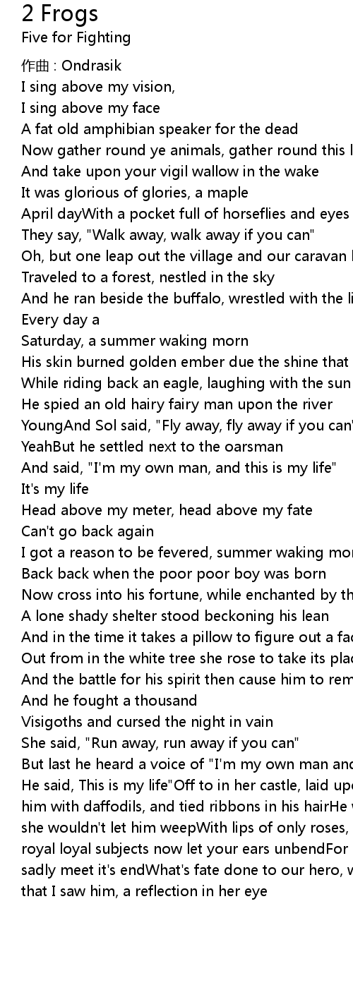 | He said, This is my life" Off to in her castle, laid upon the stairsShe showered him with daffodils, and tied ribbons in his hairHe woke bare for a moment, but she wouldn' t let him weepWith lips of only roses, she kissed him down to sleepSo royal loyal subjects now let your ears unbendFor here ye this traveled tail must sadly meet it' s endWhat' s fate done to our hero, well I cannot replyThe last that I saw him, a reflection in her eye |