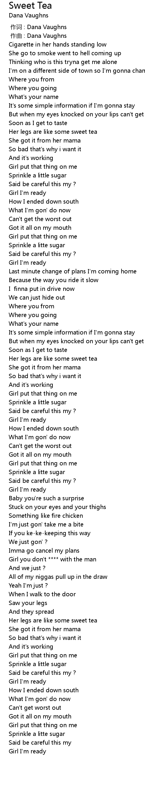 | [01:46.35] | Her legs are like some sweet tea |
