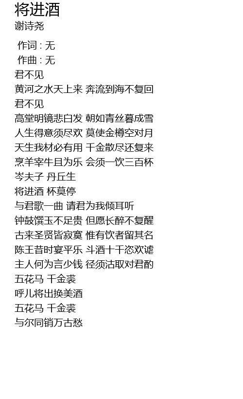| [01:52.760] | 天生我材必有用 千金散尽还复来 |