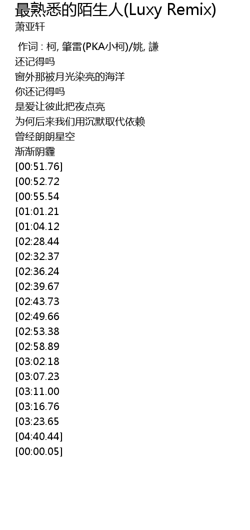 | [03:42.11][02:32.37][01:14.00] | 最熟悉的陌生人 |