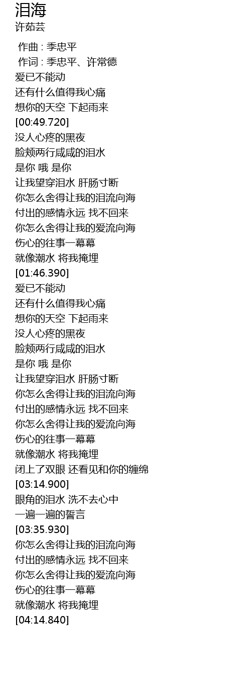 | [01:09.0] | 你怎么舍得让我的泪流向海 |
