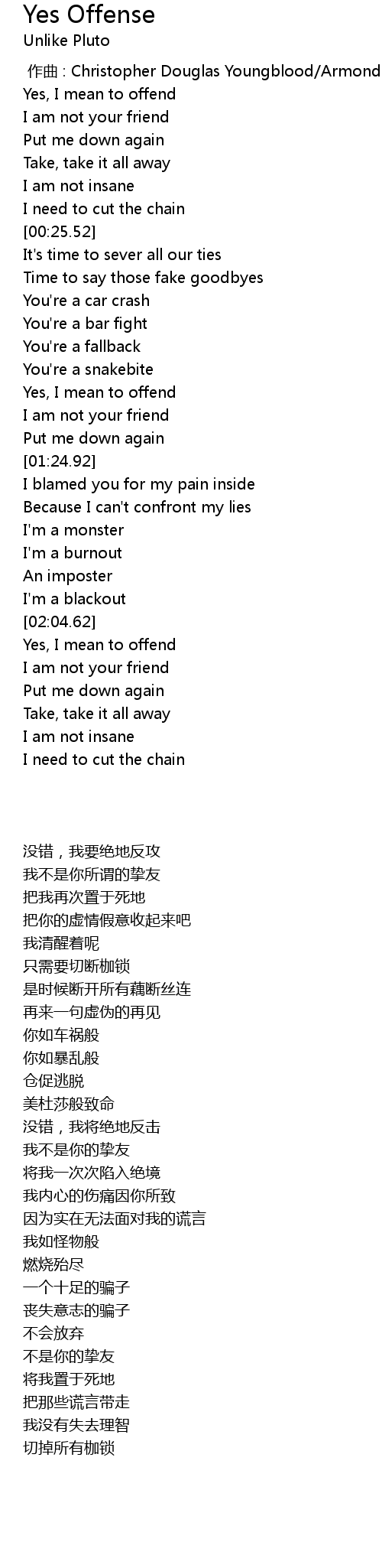 | [01:12.64] | Yes, I mean to offend |