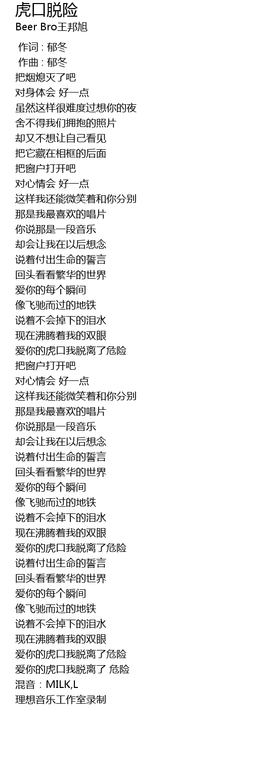 | [02:55.370] | ài nǐ de hǔ kǒu wǒ tuō lí le wēi xiǎn |