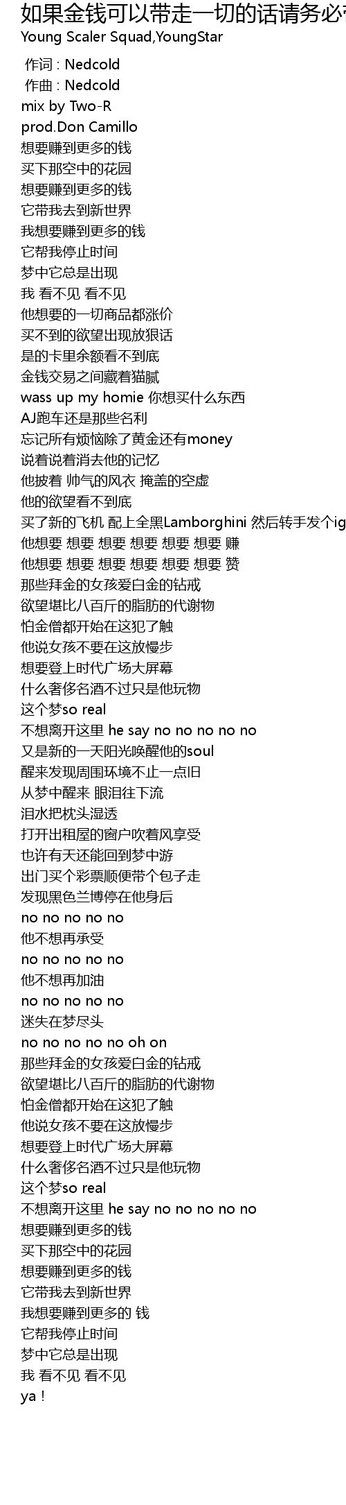 | Song | 如果金钱可以带走一切的话请务必带走我 |