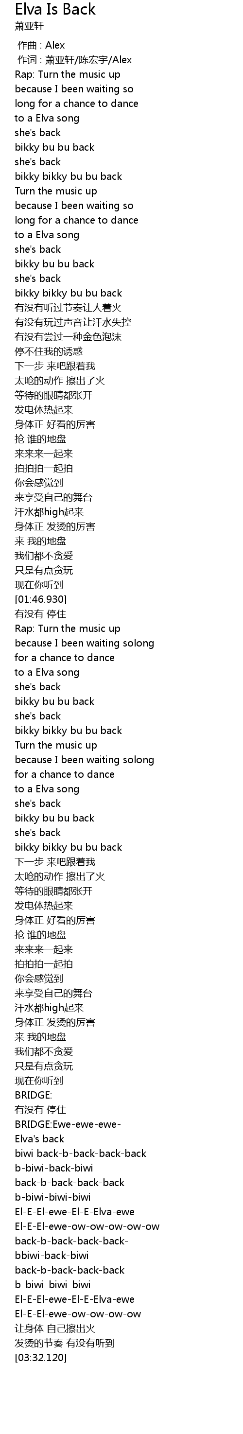 | [00:01.00] | zuò cí : xiāo yà xuān chén hóng yǔ Alex |
