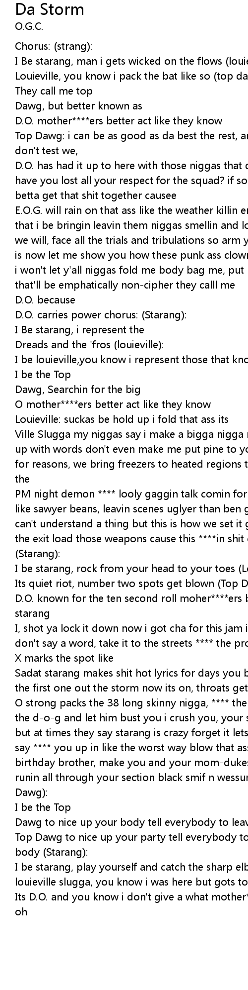 | E.O.G. will rain on that ass like the weather killin em softly with the words that i be bringin leavin them niggas smellin and lookin dead and stinkin cause we will, face all the trials and tribulations so arm yourself cause armageddon is now let me show you how these punk ass clowns are goin down slowly but surely i won't let y'all niggas fold me body bag me, put me on a plate and toe tag me that'll be emphatically non-cipher they calll me | |