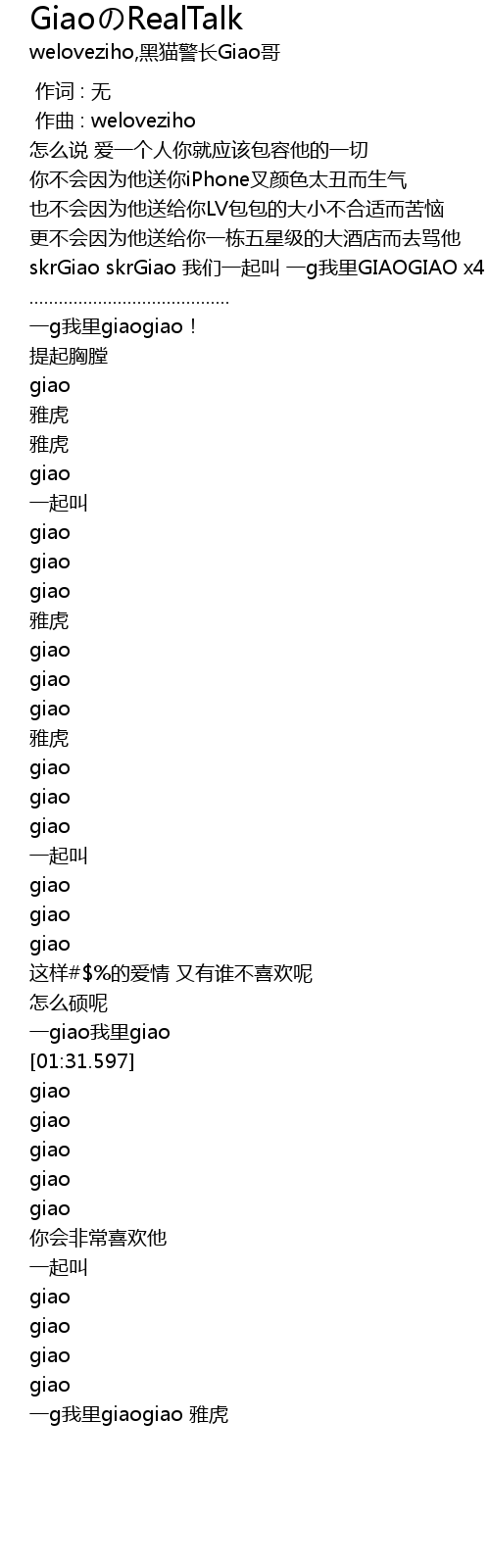 | [00:20.921] | skrGiao skrGiao 我们一起叫 一g我里GIAOGIAO x4 |