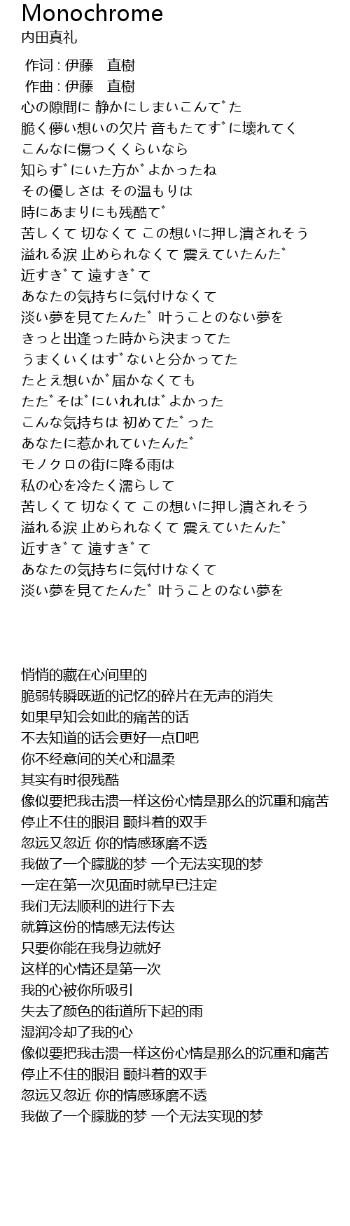 | [03:00.634] | 苦しくて 切なくて この想いに押し潰されそう |