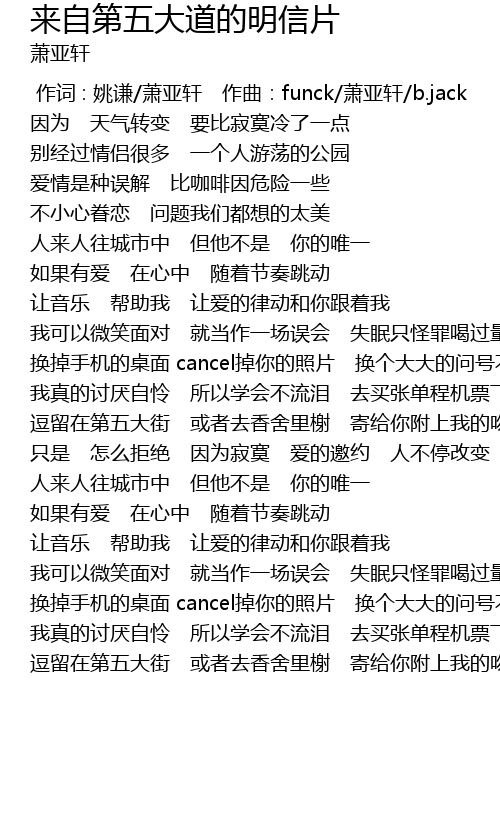 | [01:58.490] | 逗留在第五大街 或者去香舍里榭 寄给你附上我的吻的明信片 |