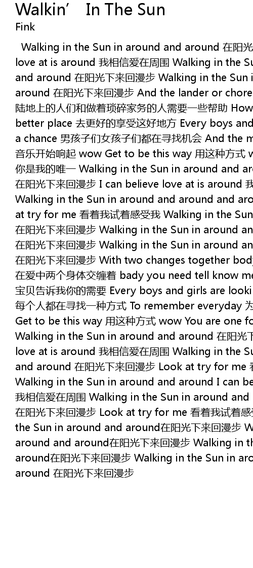 | Walking in the Sun in around and around zài yáng guāng xià lái huí màn bù I can believe love at is around wǒ xiāng xìn ài zài zhōu wéi Walking in the Sun in around and around and around zài yáng guāng xià lái huí màn bù Walking in the Sun in around and around and around zài yáng guāng xià lái huí màn bù And the lander or chorer check to want a stair lù dì shàng de rén men hé zuò zhe suǒ suì jiā wù de rén xū yào yī xiē bāng zhù How too fun the better place qù gèng hǎo de xiǎng shòu zhè hǎo dì fāng Every boys and girls are looking for a chance nán hái zi men nǚ hái zi men dōu zài xún zhǎo jī huì And the music starts to play yīn yuè kāi shǐ xiǎng qǐ wow Get to be this way yòng zhè zhǒng fāng shì wow You are one for me nǐ shì wǒ de wéi yī Walking in the Sun in around and around zài yáng guāng xià lái huí màn bù I can believe love at is around wǒ xiāng xìn ài zài zhōu wéi Walking in the Sun in around and around and around zài yáng guāng xià lái huí màn bù Look at try for me kàn zhe wǒ shì zhe gǎn shòu wǒ Walking in the Sun in around and around zài yáng guāng xià lái huí màn bù Walking in the Sun in around and around zài yáng guāng xià lái huí màn bù Walking in the Sun in around and around and around... zài yáng guāng xià lái huí màn bù With two changes together body in the sex zài ài zhōng liǎng gè shēn tǐ jiāo chán zhe bady you need tell know me bǎo bèi gào sù wǒ nǐ de xū yào Every boys and girls are looking for a manner měi ge rén dōu zài xún zhǎo yī zhǒng fāng shì To remember everyday wèi le jì niàn měi yì tiān wow Get to be this way yòng zhè zhǒng fāng shì wow You are one for me nǐ shì wǒ de wéi yī Walking in the Sun in around and around zài yáng guāng xià lái huí màn bù I can believe love at is around wǒ xiāng xìn ài zài zhōu wéi Walking in the Sun in around and around and around zài yáng guāng xià lái huí màn bù Look at try for me kàn zhe wǒ shì zhe gǎn shòu wǒ Walking in the Sun in around and around I can believe love at is around wǒ xiāng xìn ài zài zhōu wéi Walking in the Sun in around and around and around zài yáng guāng xià lái huí màn bù Look at try for me kàn zhe wǒ shì zhe gǎn shòu wǒ Walking in the Sun in around and around zài yáng guāng xià lái huí màn bù Walking in the Sun in around and around zài yáng guāng xià lái huí màn bù Walking in the Sun in around and around zài yáng guāng xià lái huí màn bù Walking in the Sun in around and around and around zài yáng guāng xià lái huí màn bù |