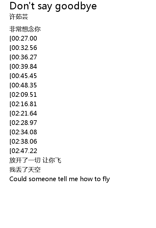 | [03:26.60][02:09.51][00:52.67] | Tell me You don' t wanna say goodbye goodbye |
