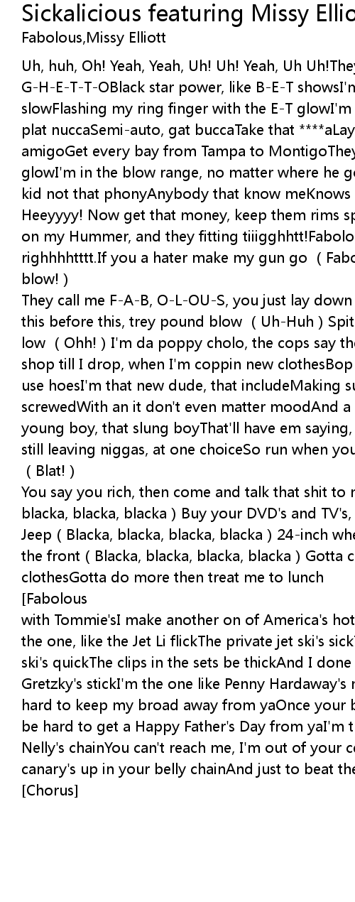 | Missy Elliott Heeyyyy! Now get that money, keep them rims spicheeeeyyy! 24 shoes on my Hummer, and they fitting tiiigghhtt! Fabolous and Missy, Sickalicious righhhhtttt. If you a hater make my gun go Fabolous: Blocka, blocka, blocka, blow! | |