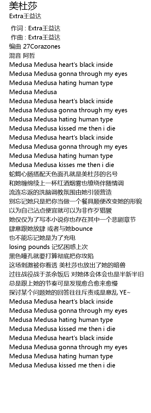 | [00:15.35] | Medusa Medusa heart' s black inside |