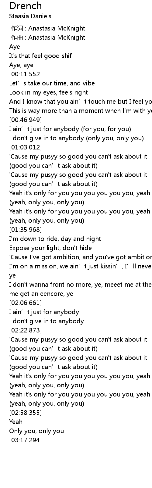 | [02:31.746] | 'Cause my pusyy so good you can't ask about it |