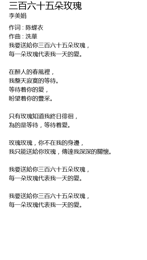 | wǒ yào sòng gěi nǐ sān bǎi liù shí wǔ duǒ méi guī, | |