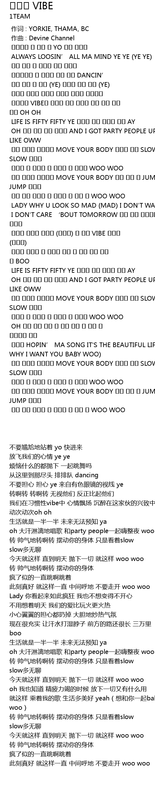 | [01:36.241] | 시시한 걱정은 던지고 (던지고) 겁 없이 VIBE 살리고 (살리고) |