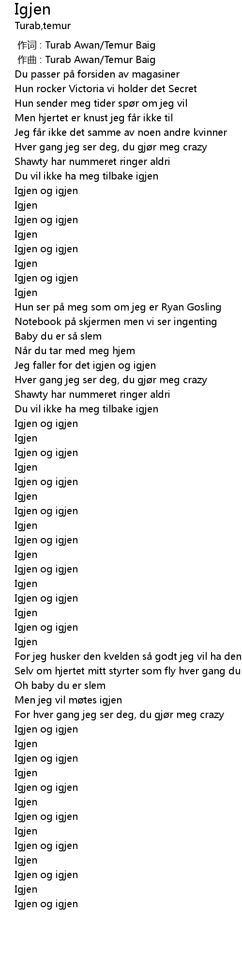 | [00:25.810] | Hver gang jeg ser deg, du gjør meg crazy |