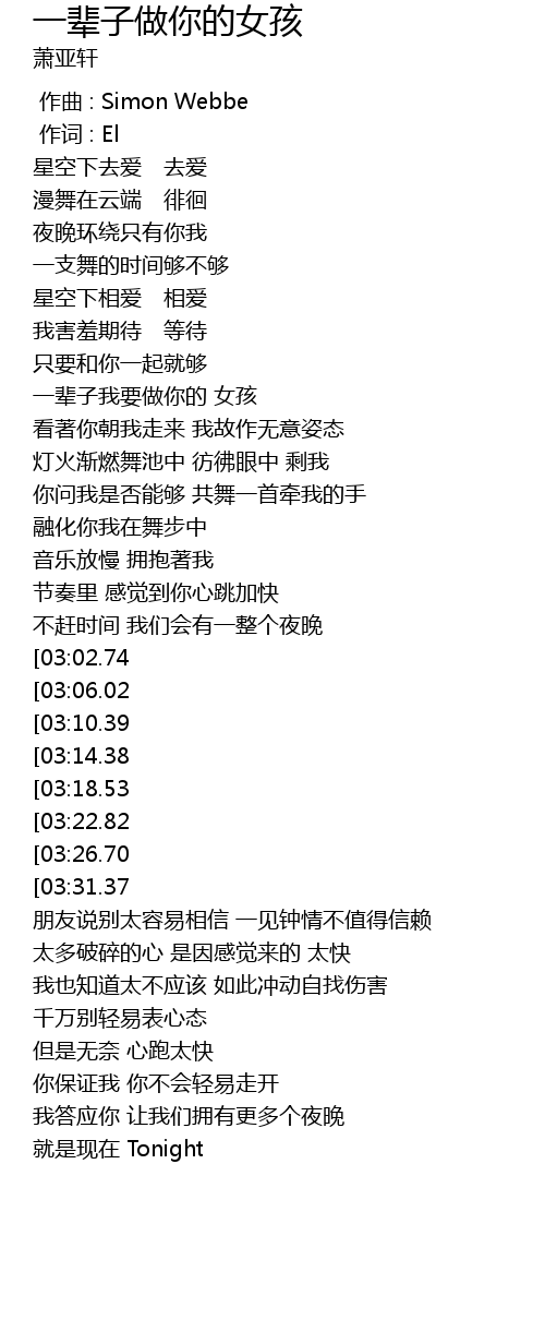 | [04:05.57][03:31.37][02:04.98] | 一辈子我要做你的 女孩 |