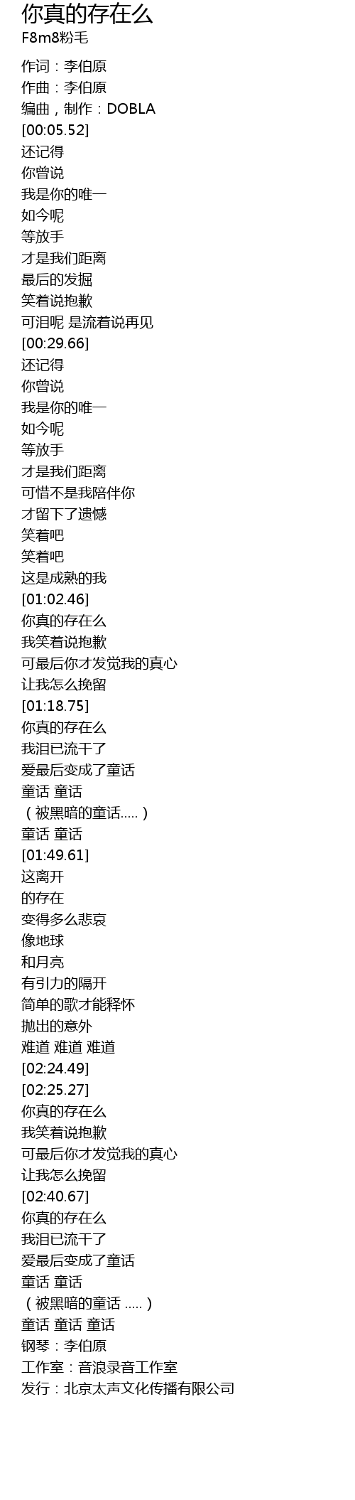 | [02:41.09] | nǐ zhēn de cún zài me |