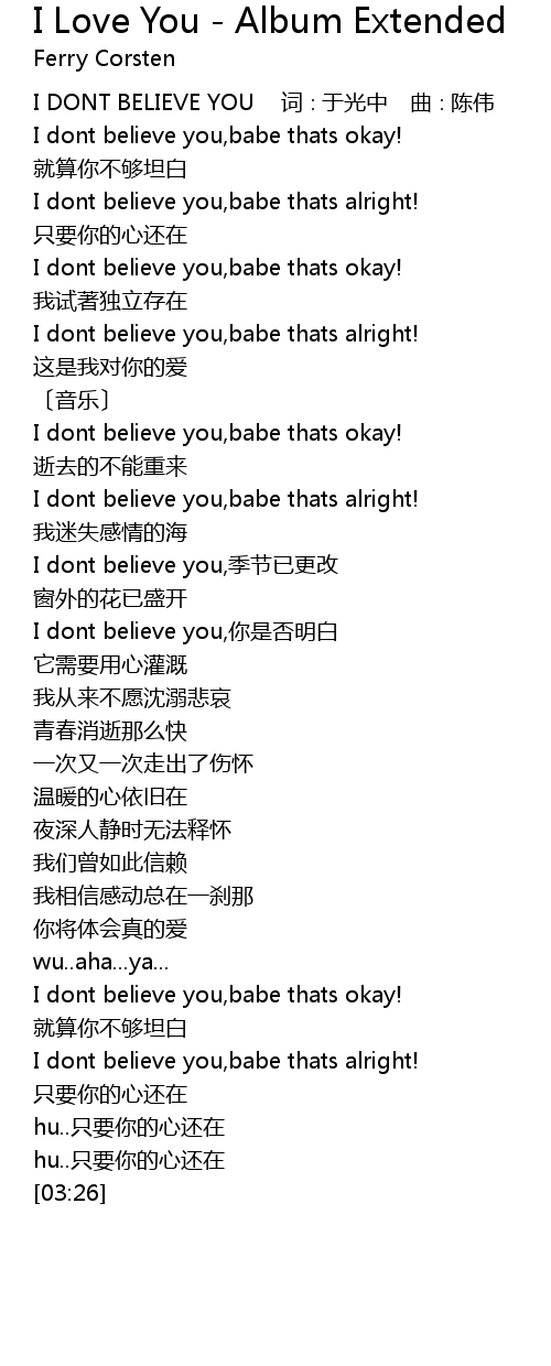 | [00:00] | I DONT BELIEVE YOU 词∶于光中 曲∶陈伟 |