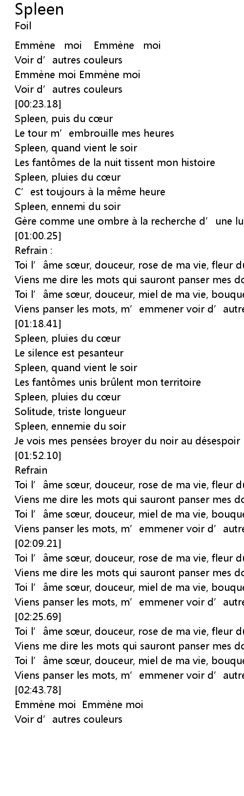 | [02:31.33] | Viens me dire les mots qui sauront panser mes douleurs |