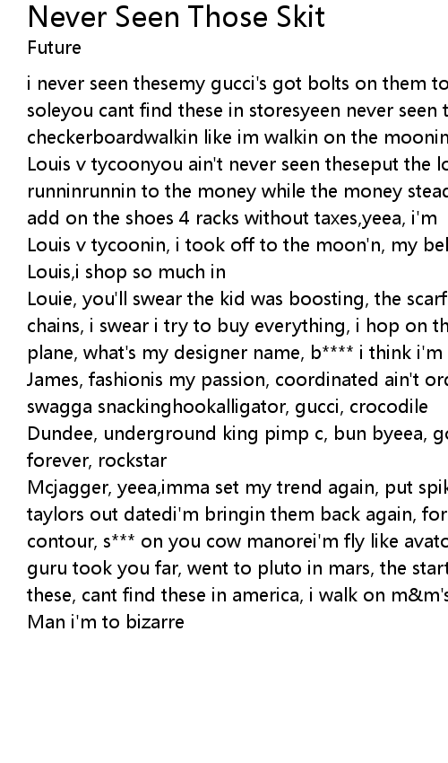 Louie, you'll swear the kid was boosting, the scarfs and shadesthe wallets, chains, i swear i try to buy everything, i hop on the plane, flyerthan the plane, what's my designer name, b**** i think i'm rick |