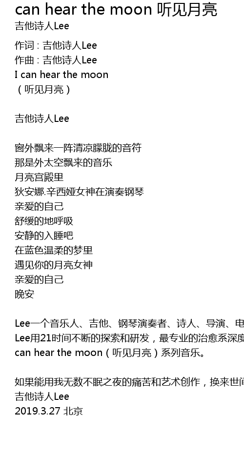 | Lee yòng 21 shí jiān bù duàn de tàn suǒ hé yán fā, zuì zhuān yè de zhì yù xì shēn dù cuī mián yīn yuè I can hear the moon tīng jiàn yuè liàng xì liè yīn yuè. | |