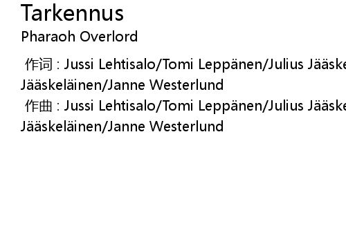 | [00:00.000] | zuò cí : Jussi Lehtisalo Tomi Lepp nen Julius J skel inen Pekka J skel inen Janne Westerlund |