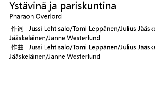 | [00:00.000] | zuò cí : Jussi Lehtisalo Tomi Lepp nen Julius J skel inen Pekka J skel inen Janne Westerlund |