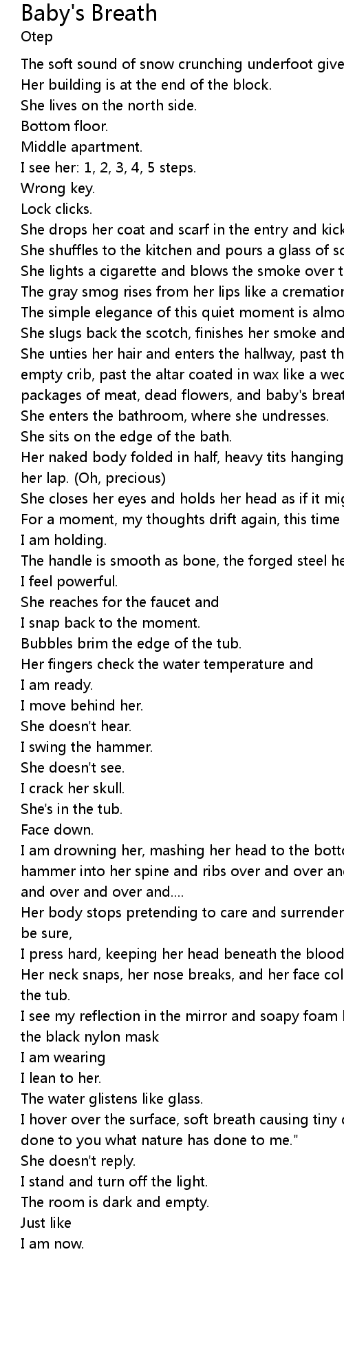 | I am drowning her, mashing her head to the bottom, knifing the claw of the hammer into her spine and ribs over and over and over and over and over and over and over and over and.... | |