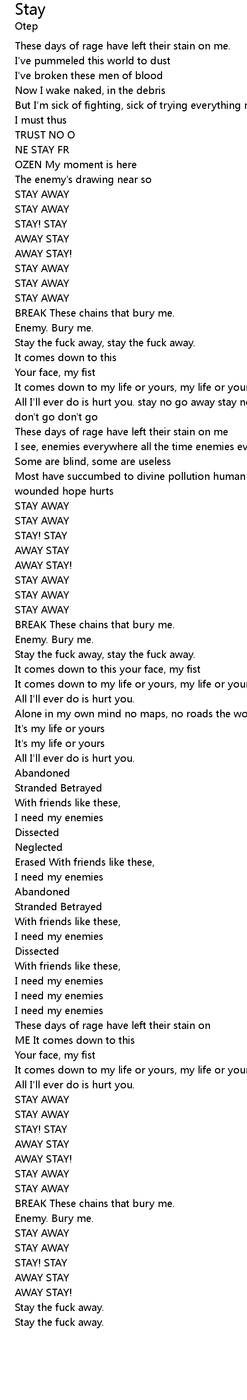 | All I'll ever do is hurt you. stay no go away stay no go away stay no go away don't go don't go | |