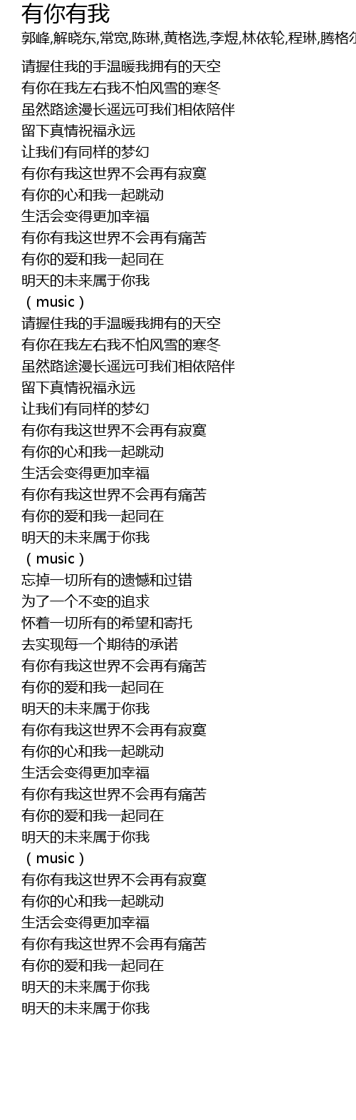 [04:33.35] yǒu nǐ yǒu wǒ zhè shì jiè bú huì zài yǒu tòng kǔ