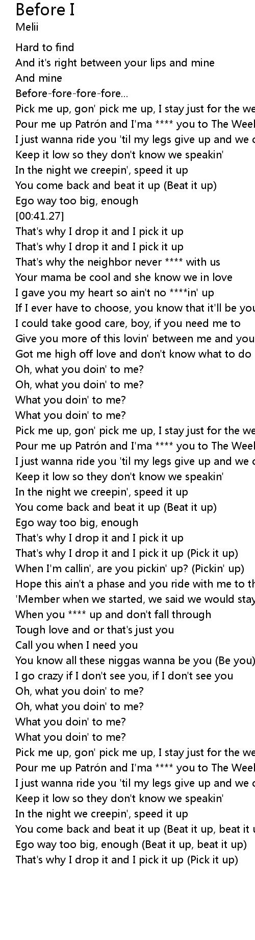 | [00:18.45] | Pour me up Patrón and I'ma **** you to The Weeknd |
