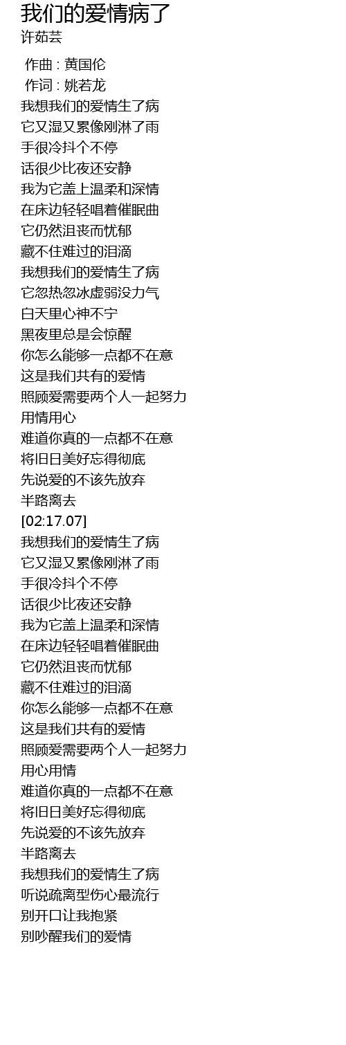 | [02:38.93] | wǒ xiǎng wǒ men de ài qíng shēng le bìng |