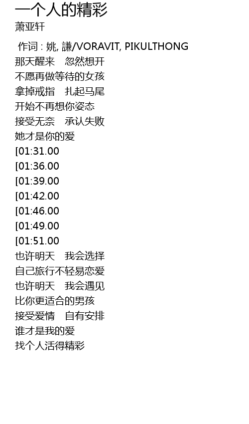 | [00:58.00][01:51.00][02:29.00] | 一个人活得精彩 |