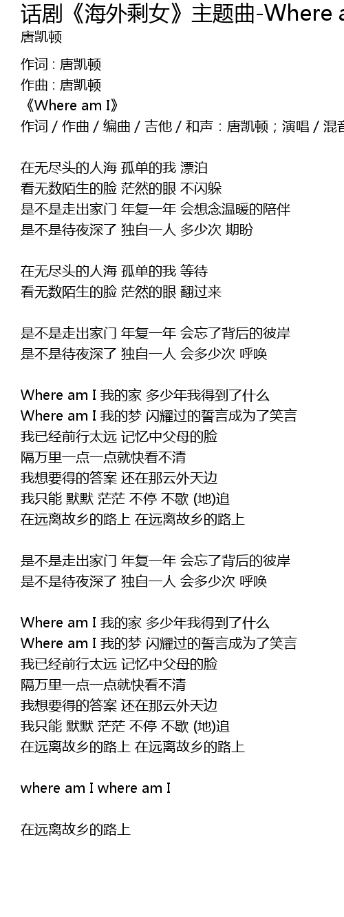 | Song | 话剧《海外剩女》主题曲-Where am I |
