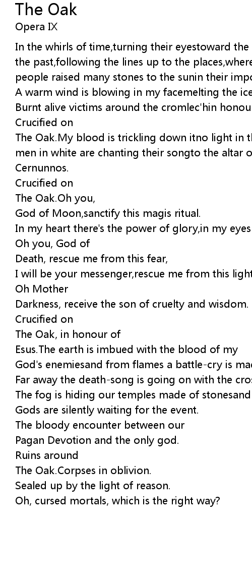 The Oak.My blood is trickling down itno light in this church made of treessome men in white are chanting their songto the altar of |