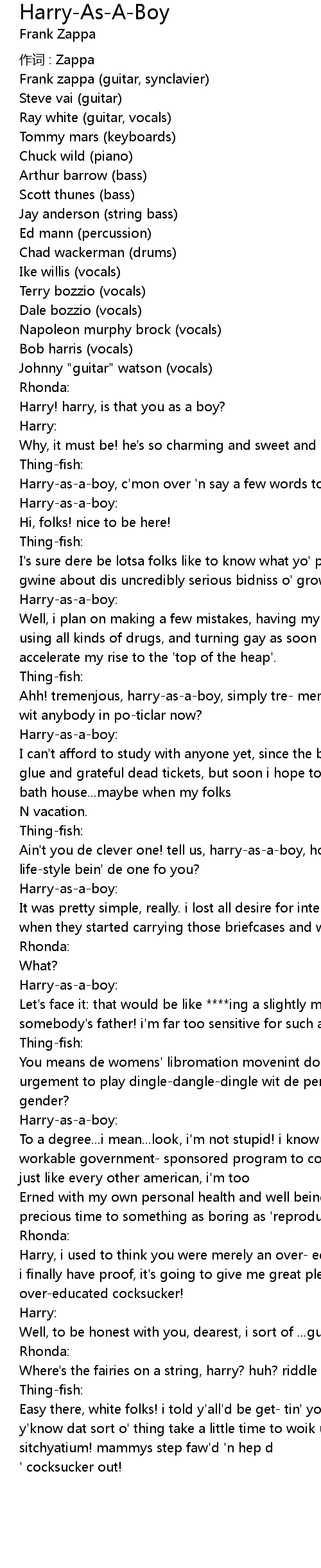 | Ain't you de clever one! tell us, harry-as-a-boy, howdja recide upon dis heah life-style bein' de one fo you? | |