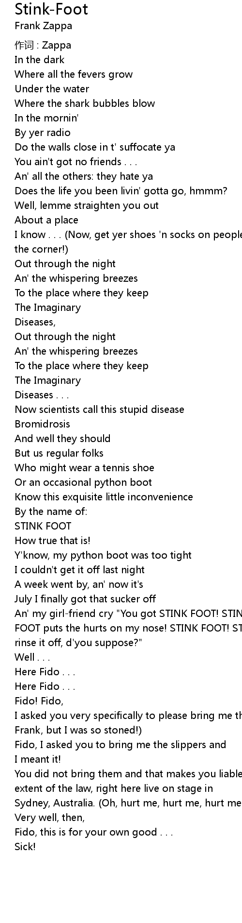 | An' my girlfriend cry " You got STINK FOOT! STINK FOOT, darlin' Your STINKIN' FOOT puts the hurts on my nose! STINK FOOT! STINK FOOT! I ain' t lyin', Can you rinse it off, d' you suppose?" | |