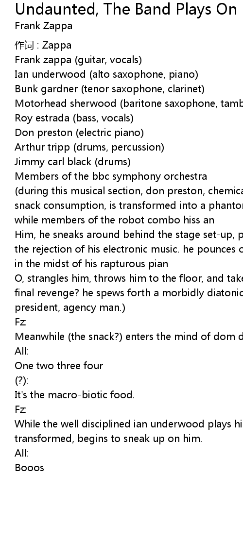 | during this musical section, don preston, chemically altered via macrobiotic snack consumption, is transformed into a phantom of the operalike monster. while members of the robot combo hiss an | |