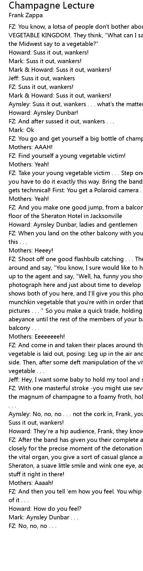 FZ: With one masterful stroke -you might use several masterful strokes- shake up the magnum of champagne to a foamy froth, holding your thumb over the end of it . . . |