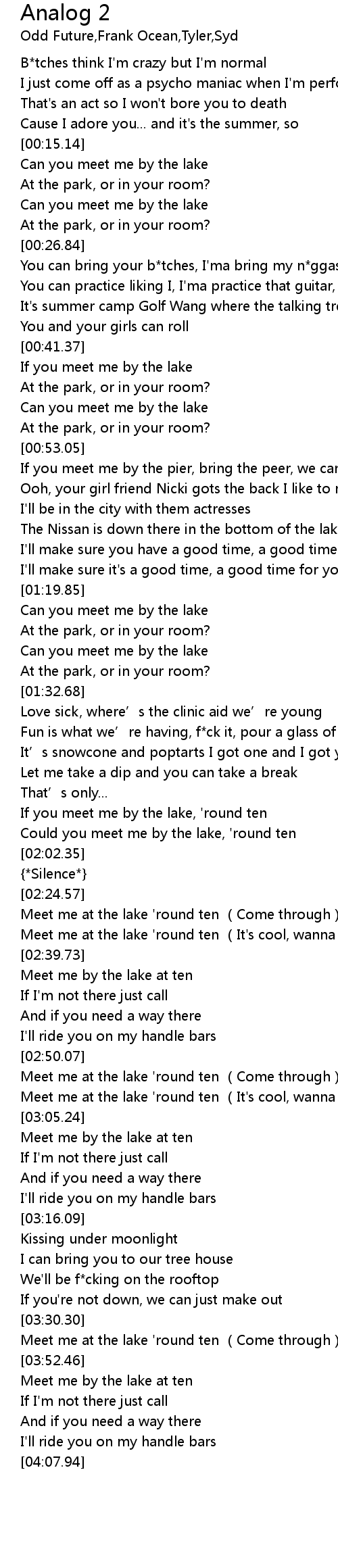 | [02:27.35] | Meet me at the lake ' round ten Come through |